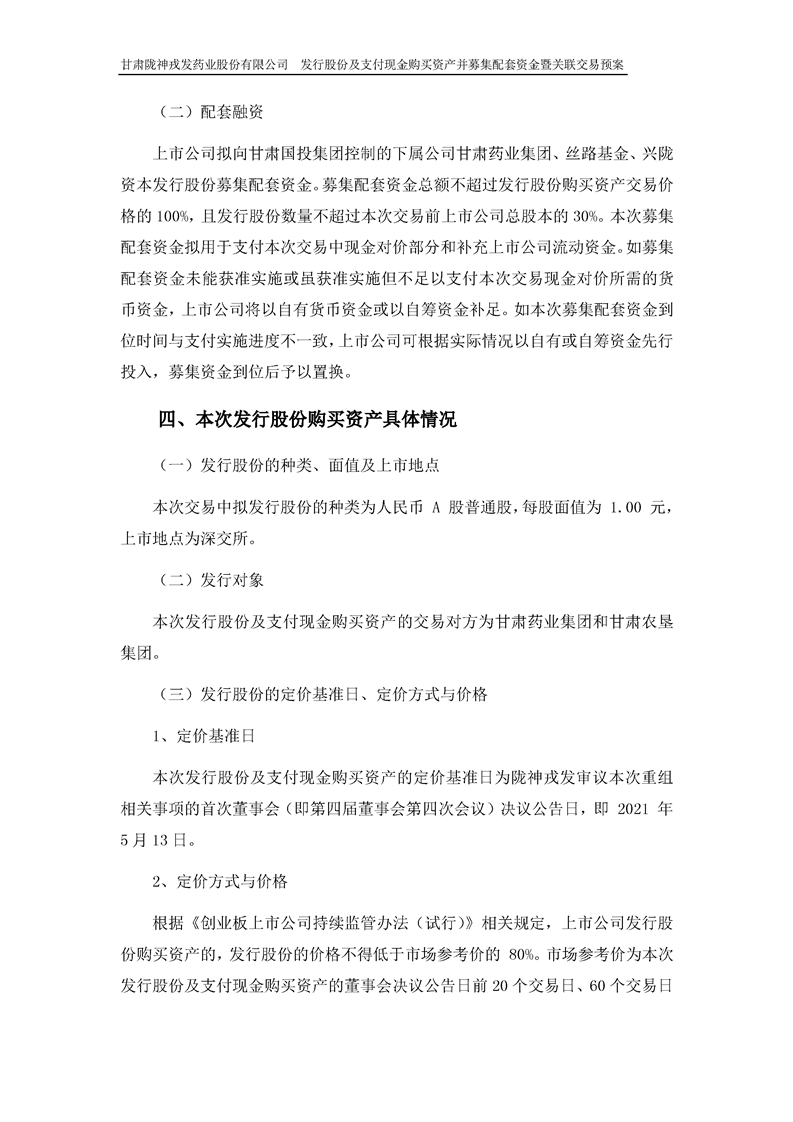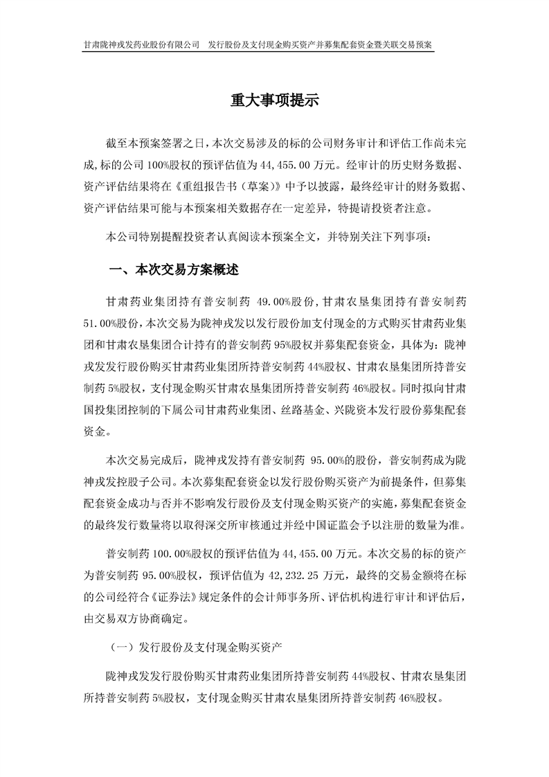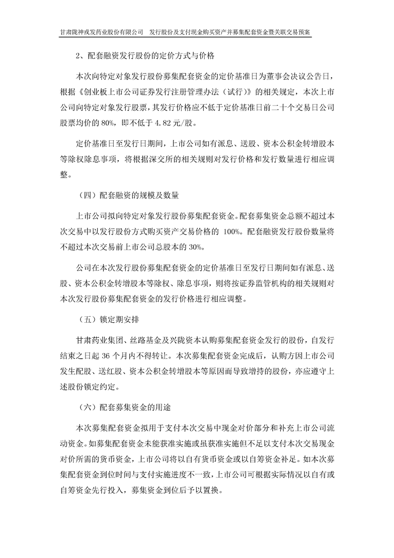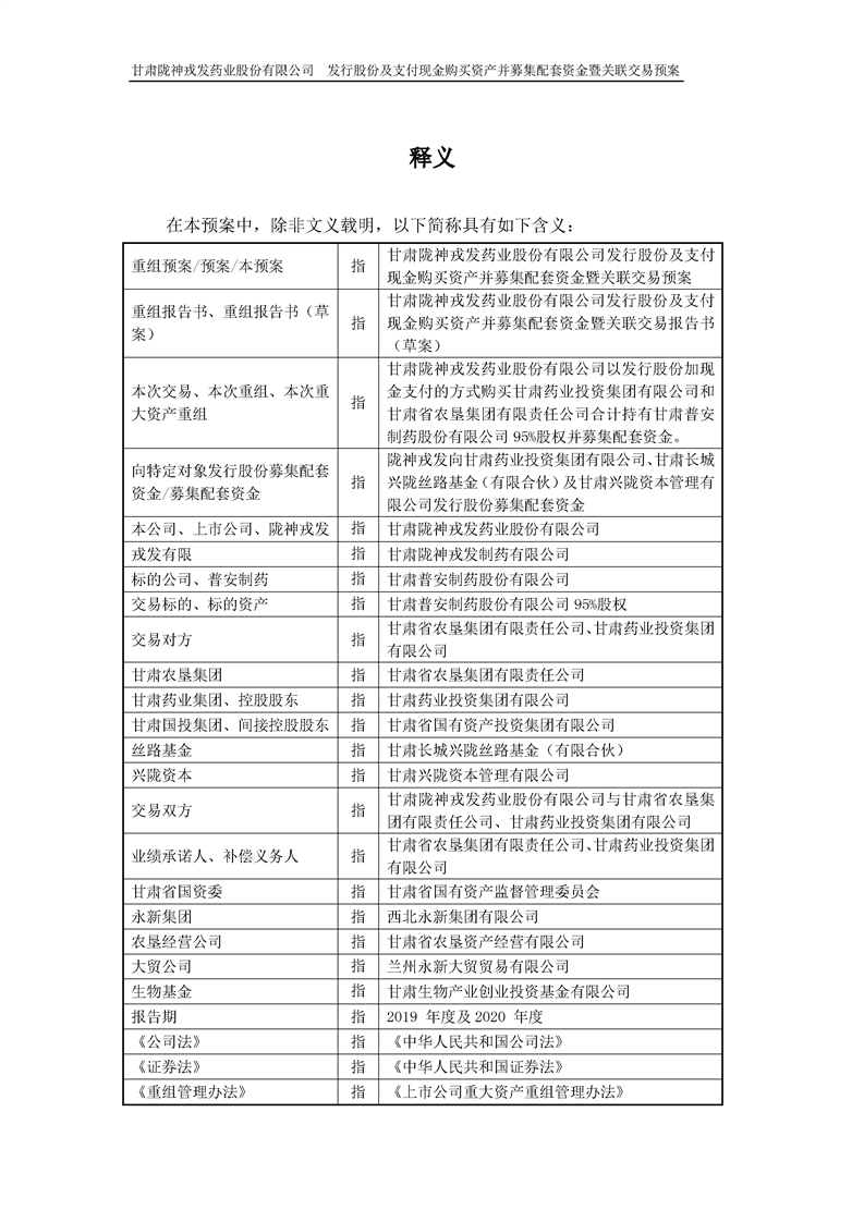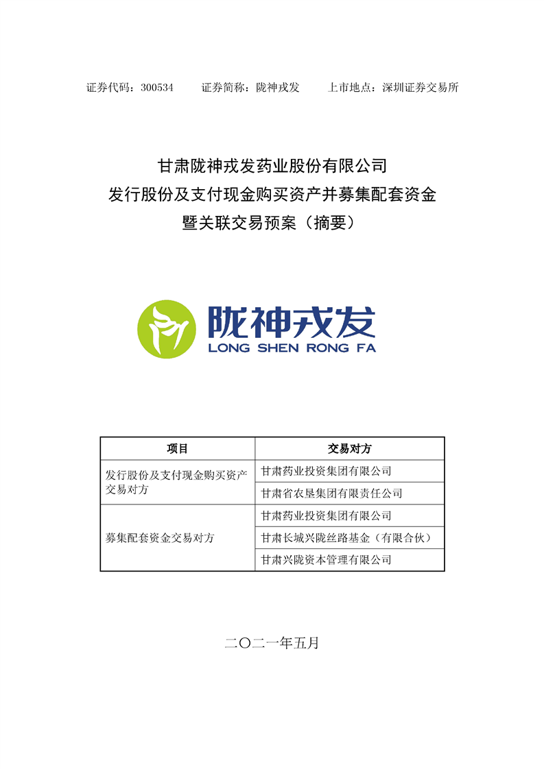 甘肅隴神戎發藥業股份有限公司發行股份及支付現金購買資產并募集配套資金暨關聯交易預案 (摘要)