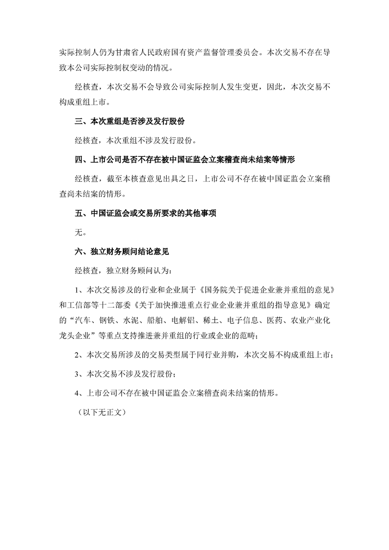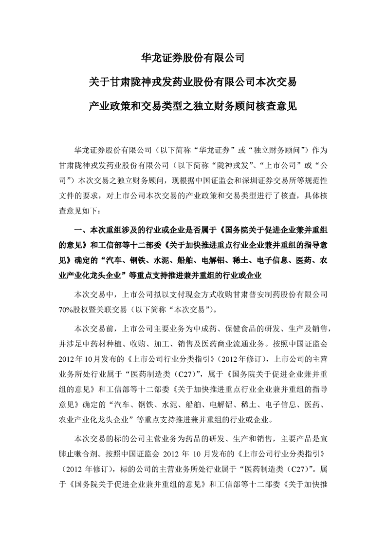 華龍證券股份有限公司關于甘肅隴神戎發藥業股份有限公司本次交易產業政策和交易類型之獨立財務顧問核查意見