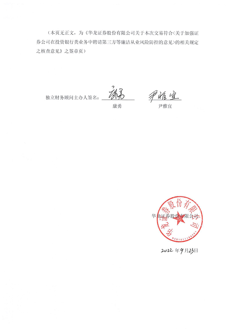 華龍證券股份有限公司關于本次交易符合《關于加強證券公司在投資銀行類業務中聘請第三方等廉潔從業風險防控的意見》的相關規定之核查意見