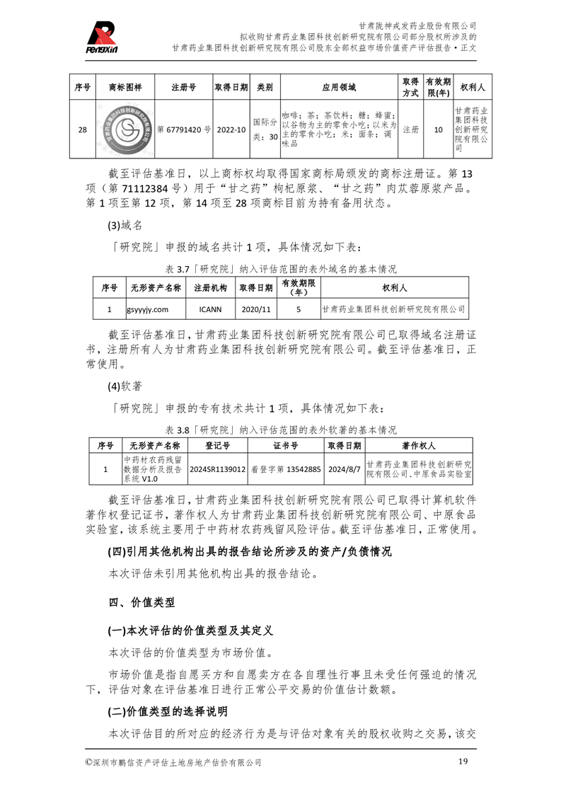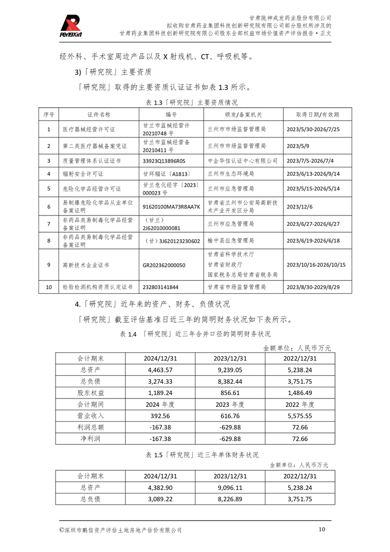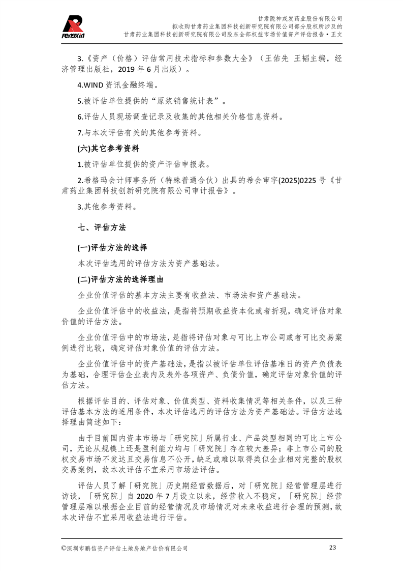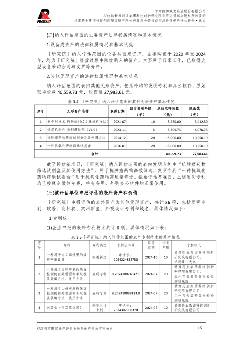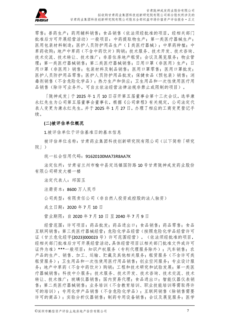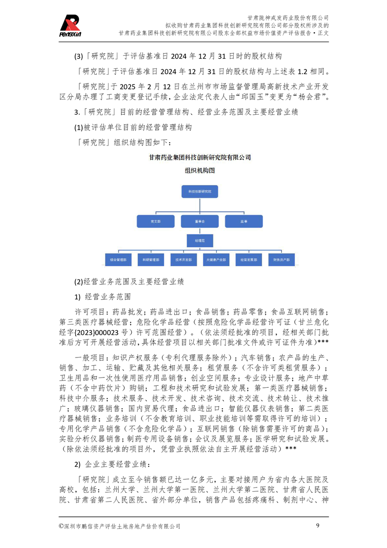 甘肅藥業集團科技創新研究院有限公司股東全部權益市場價值資產評估報告(鵬信資評報字[2025]第S039號)