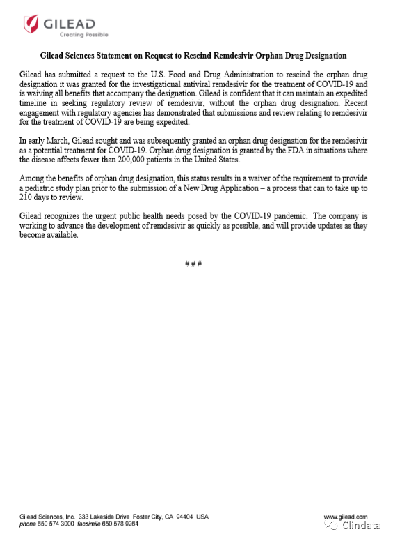 Gilead Sciences Statement on Request to Rescind Remdesivir orphan Drug Designation Gilead has submitted a request to the U.S. Food and Drug Administration to rescind the orphan drug designation it was granted for the investigational antiviral remdesivir for the treatment of COVID-19 and is waiving all benefits that accompany the designation. Gilead is confident that it can maintain an expedited timeline in seeking regulatory review of remdesivir, without the orphan drug designation. Recent engagement with regulatory agencies has demonstrated that submissions and review relating to remdesivir for the treatment of COVID-19 are being expedited.