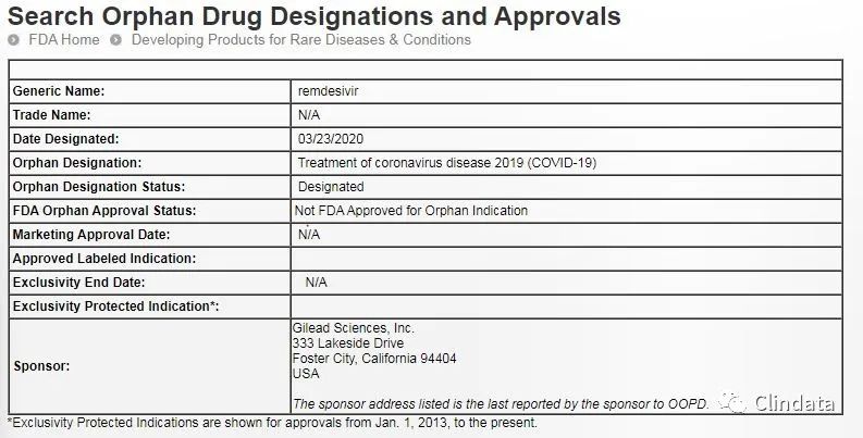 3月23日,FDA官網數據庫顯示,FDA授予吉利德科學(Gilead Sciences)公司開發的在研抗病毒療法瑞德西韋(remdesivir)孤兒藥資格(Orphan Drug Designation),其適應癥為冠狀病毒疾病2019(COVID-19)。