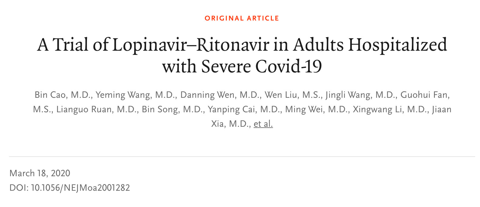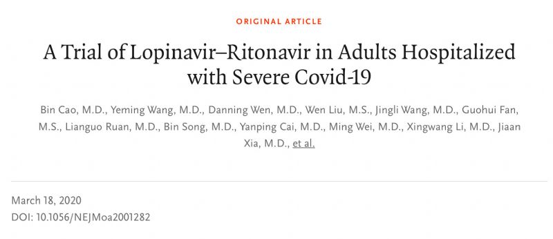 3月18日,眾所期待的洛匹那韋-利托那韋治療新冠臨床試驗結果,在《新英格蘭醫學雜志》上發布,結果讓人失望,在重癥患者中,與常規治療相比,研究未能觀察到洛匹那韋-利托那韋治療的有效性。