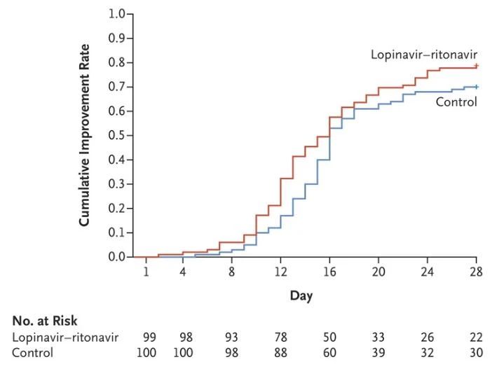 臨床癥狀改善:兩組患者出現臨床狀況改善中位時間相同,均為16天。洛匹那韋-利托那韋組與常規治療組患者的風險比為1.31(95% 置信度,0.95-1.80),未能表現出顯著差異。
