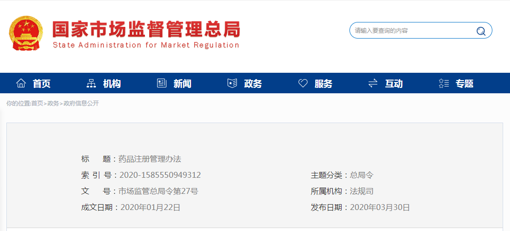 《藥品注冊管理辦法》已于2020年1月15日經國家市場監督管理總局2020年第1次局務會議審議通過,現予公布,自2020年7月1日起施行。