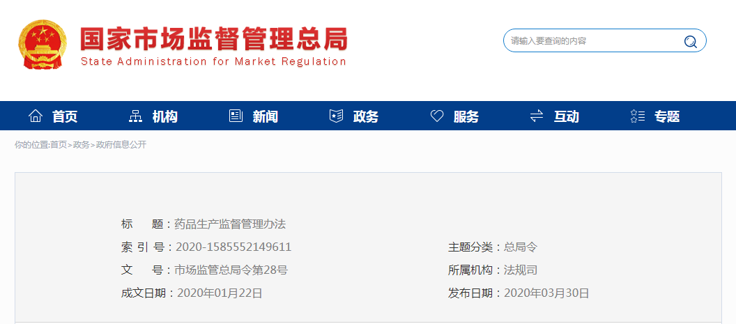 《藥品生產監督管理辦法》已于2020年1月15日經國家市場監督管理總局2020年第1次局務會議審議通過,現予公布,自2020年7月1日起施行。