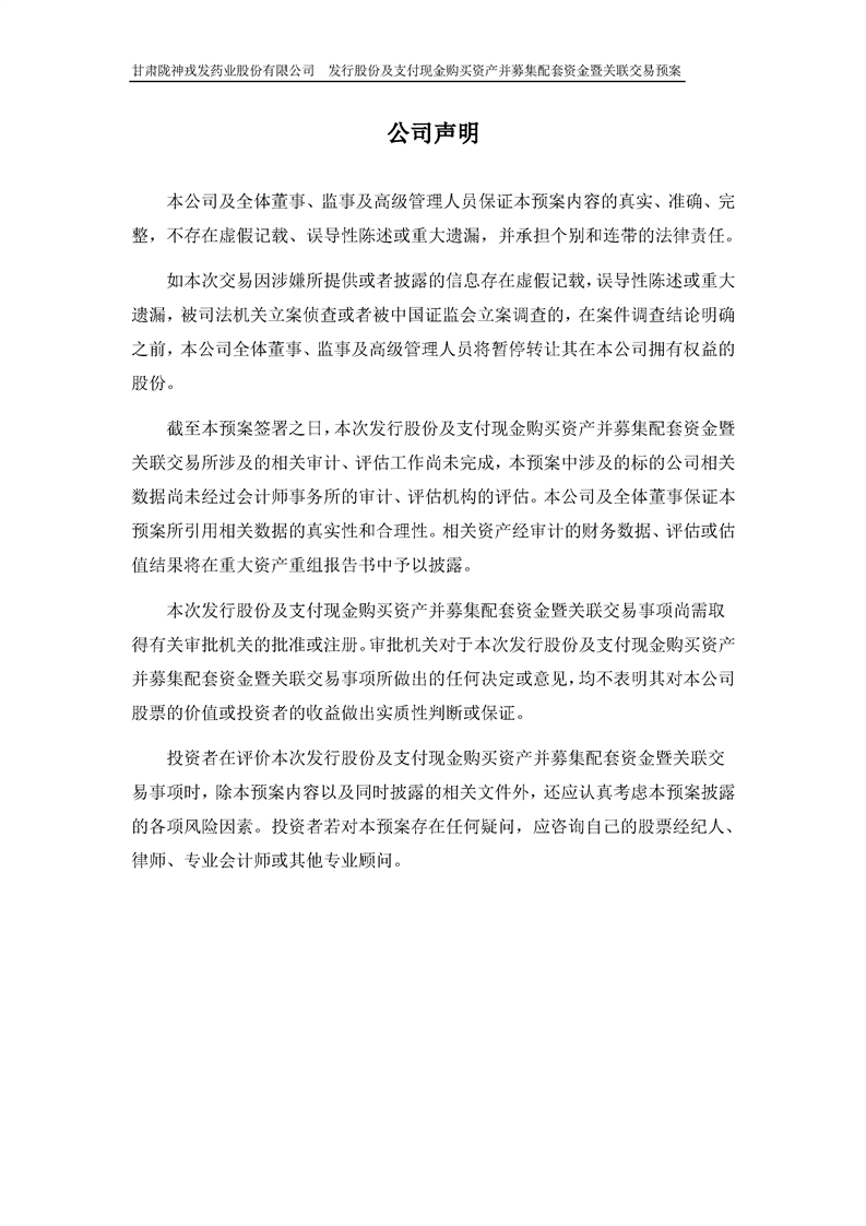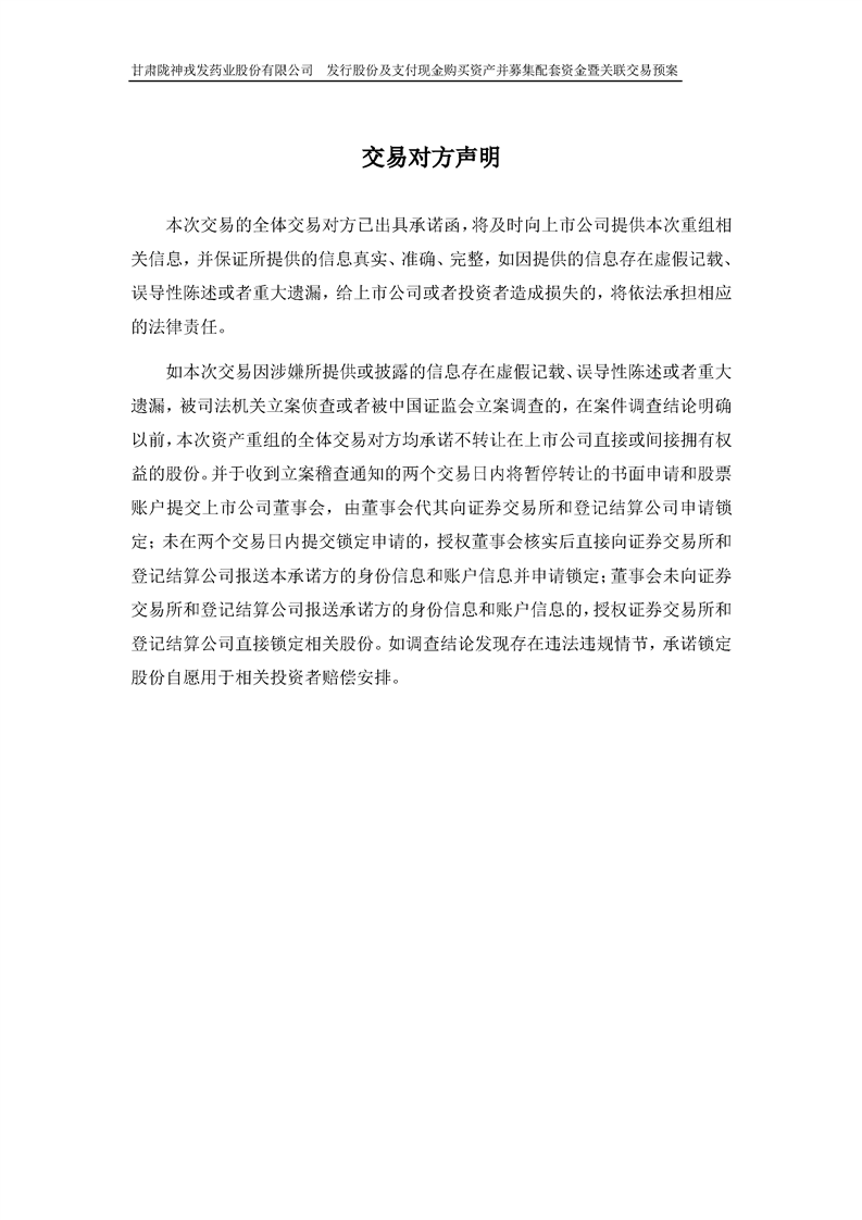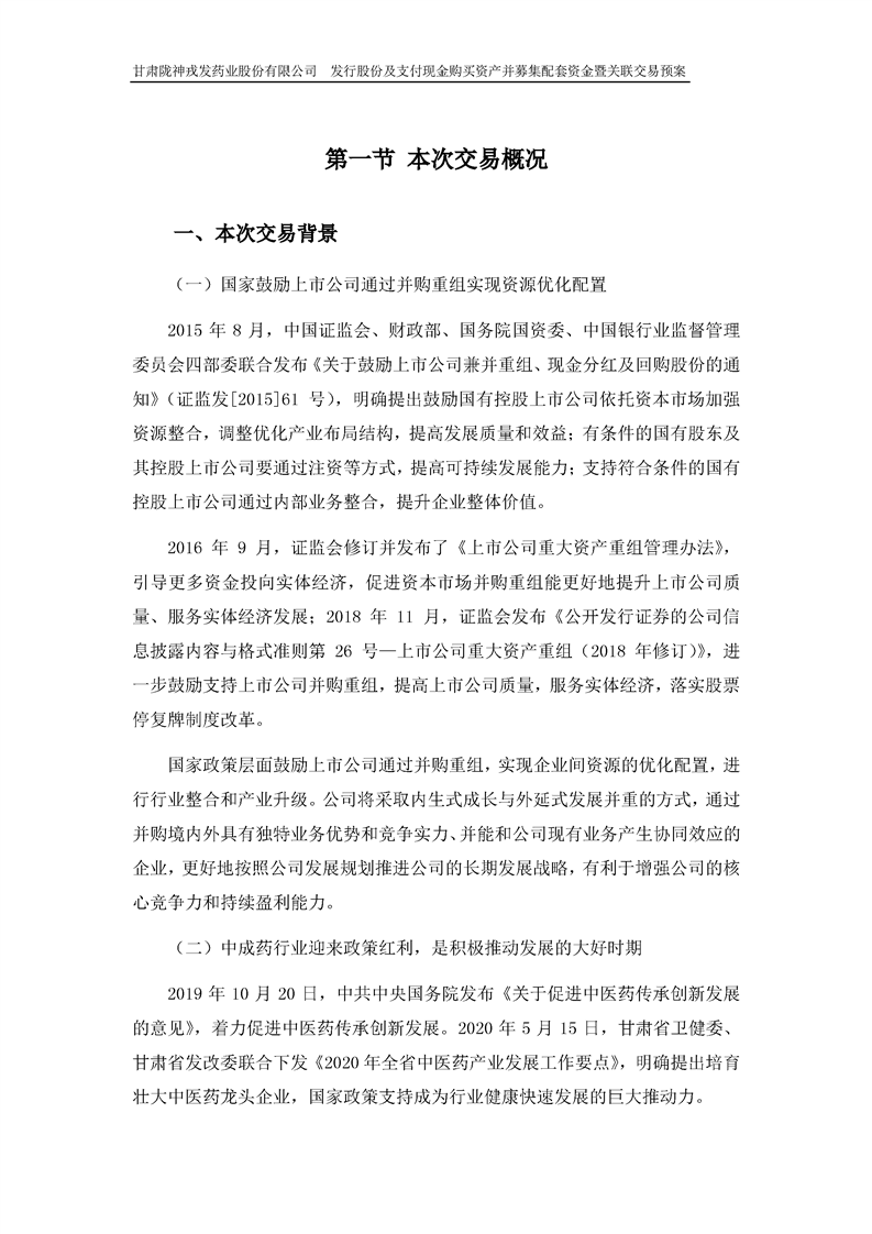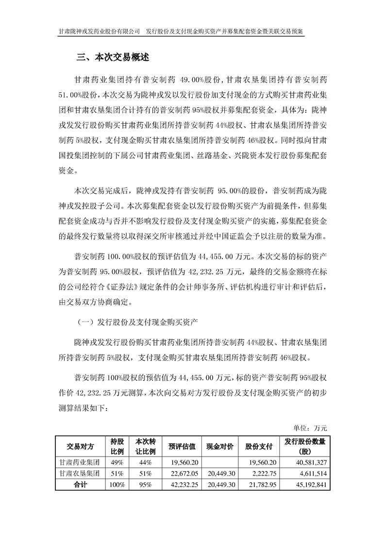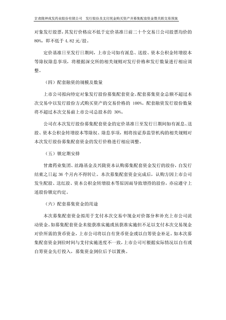 甘肅隴神戎發藥業股份有限公司發行股份及支付現金購買資產并募集配套資金暨關聯交易預案 (摘要)