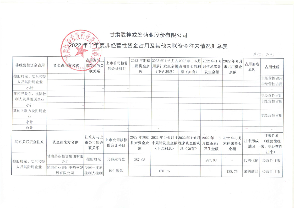 2022年半年度非經營性資金占用及其他關聯資金往來情況匯總表