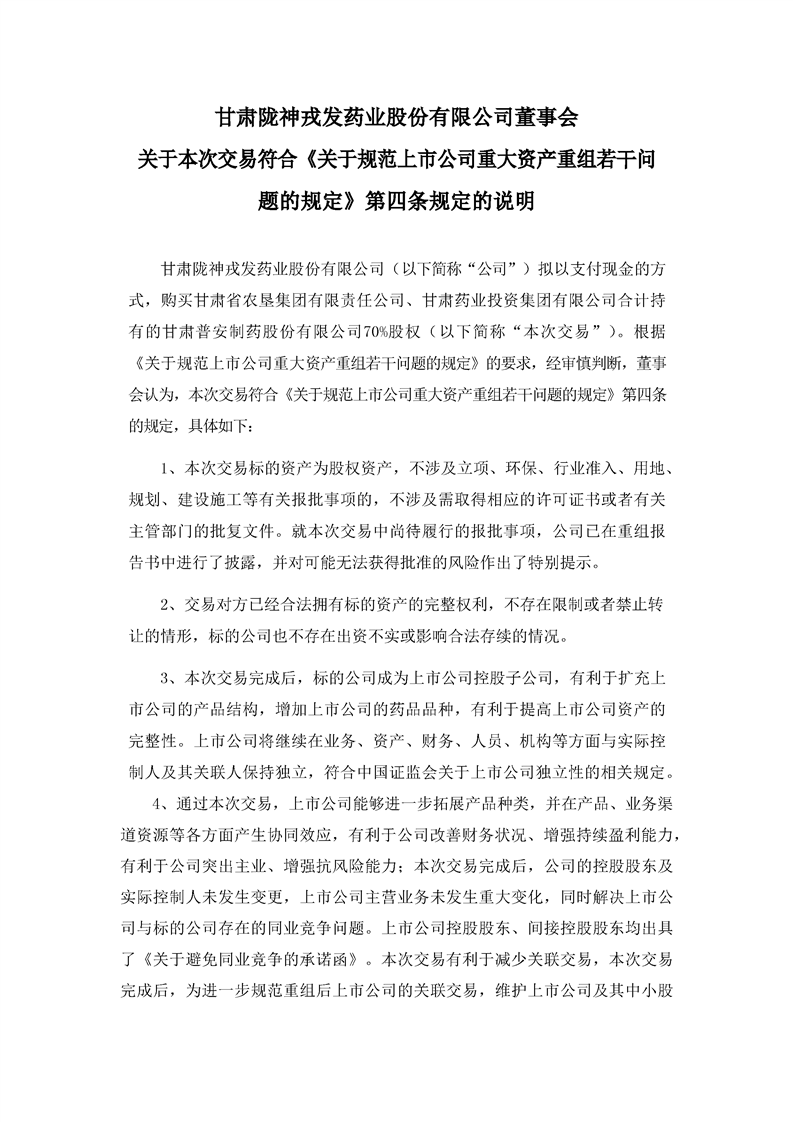 董事會關于本次交易符合《關于規范上市公司重大資產重組組若干問題的規定》第四條規定的說明