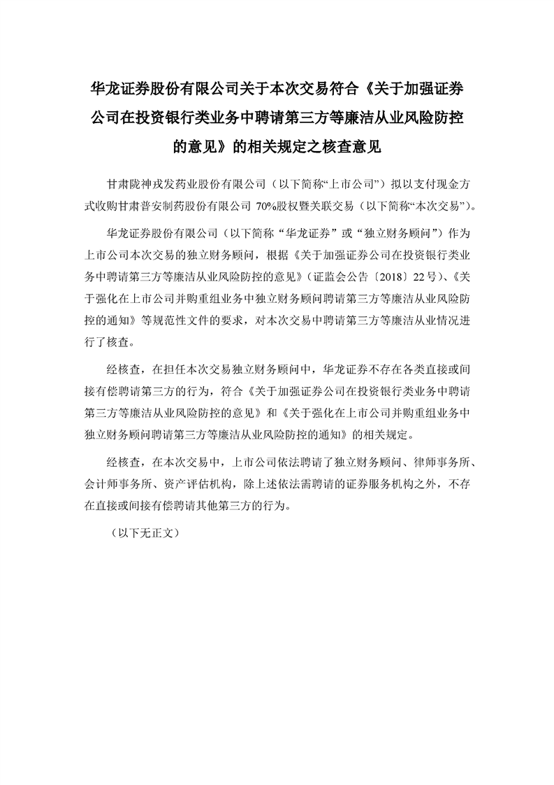 華龍證券股份有限公司關于本次交易符合《關于加強證券公司在投資銀行類業務中聘請第三方等廉潔從業風險防控的意見》的相關規定之核查意見