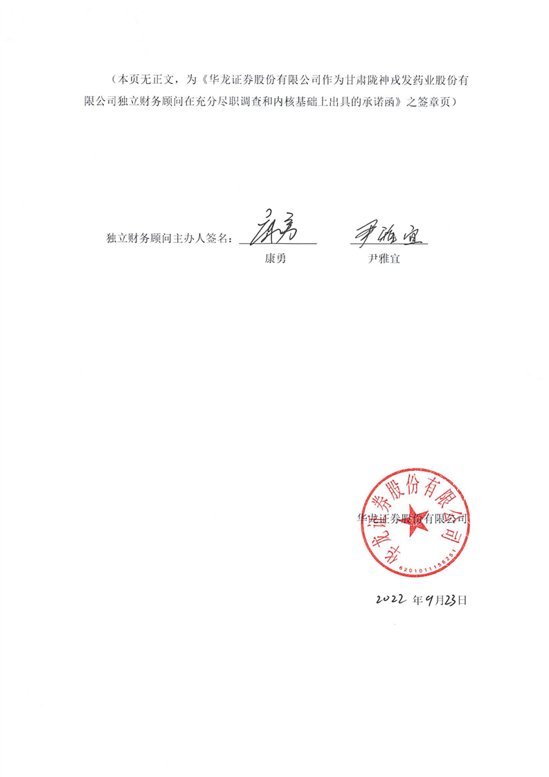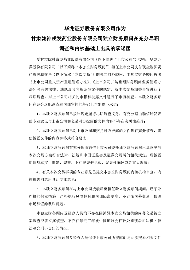 華龍證券股份有限公司作為甘肅隴神戎發藥業股份有限公司獨立財務顧問在充分盡職調查和內核基礎上出具的承諾函