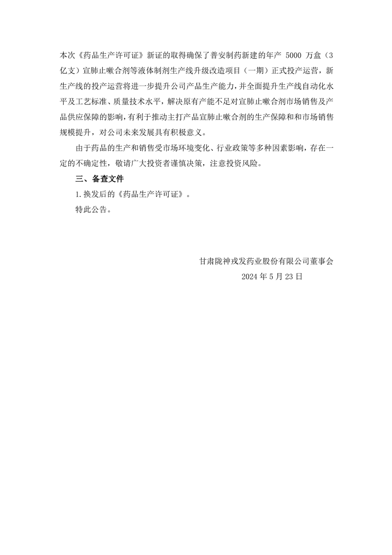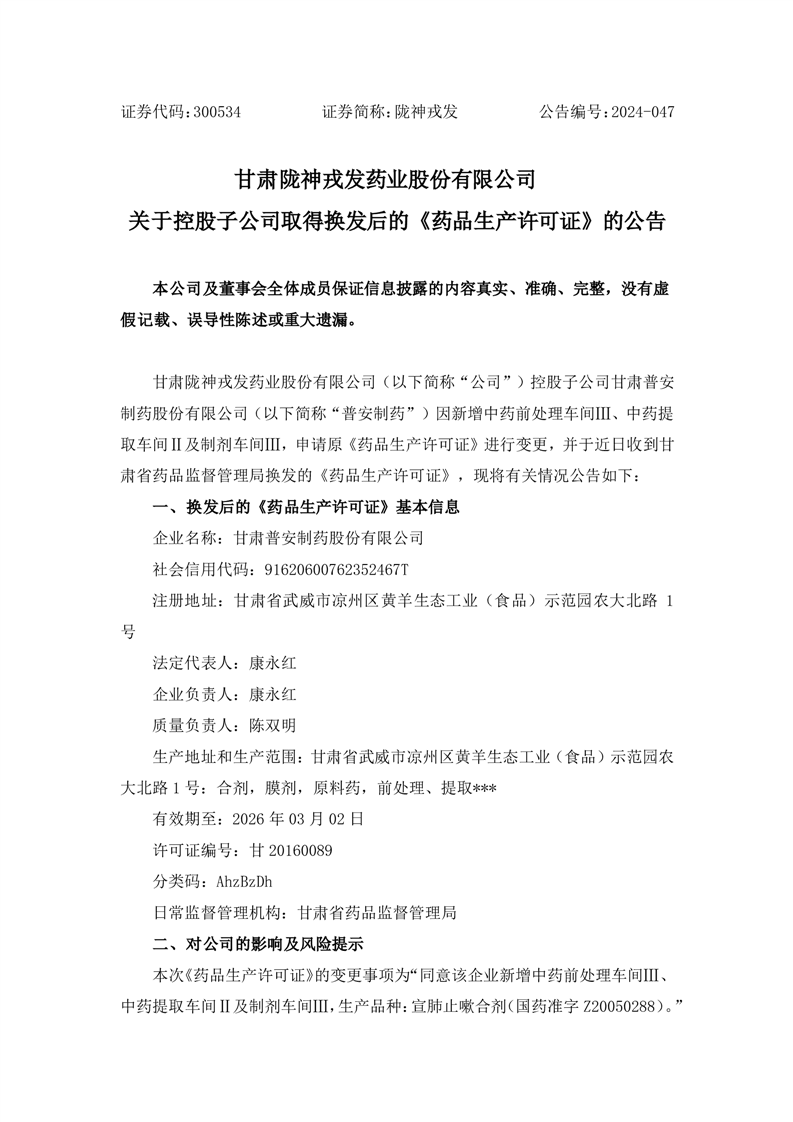 關于控股子公司取得換發后的《藥品生產許可證》的公告