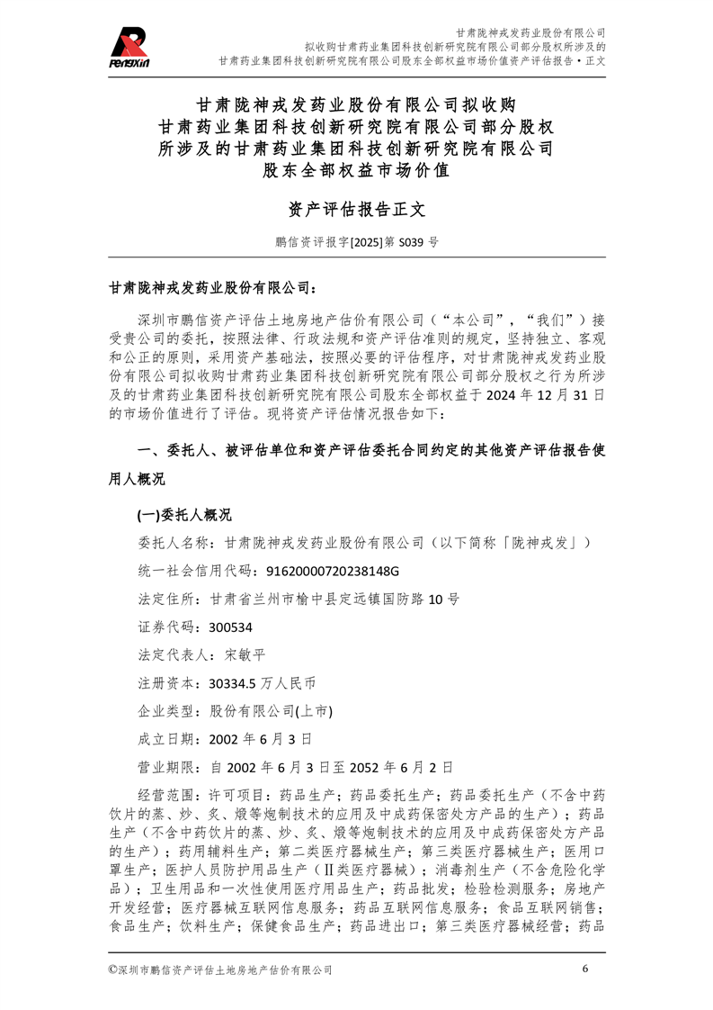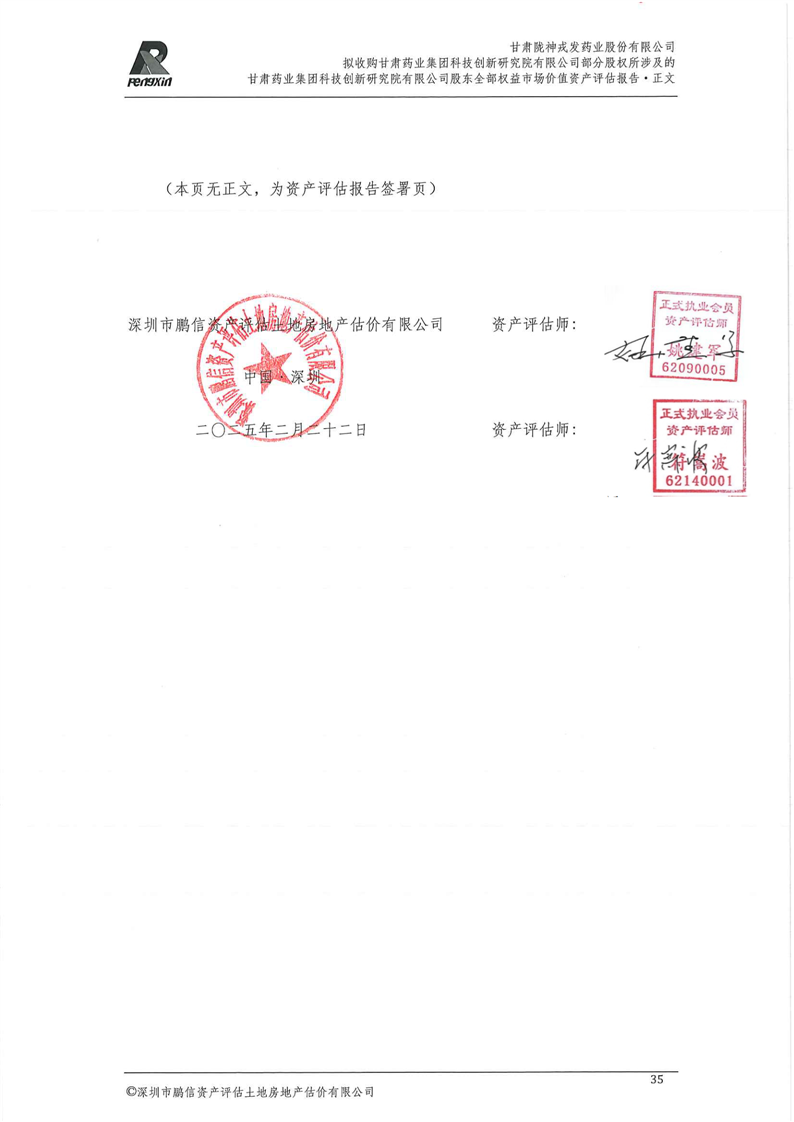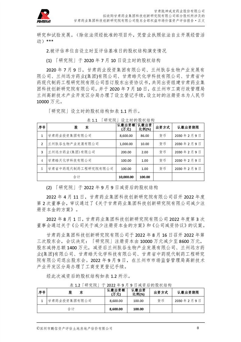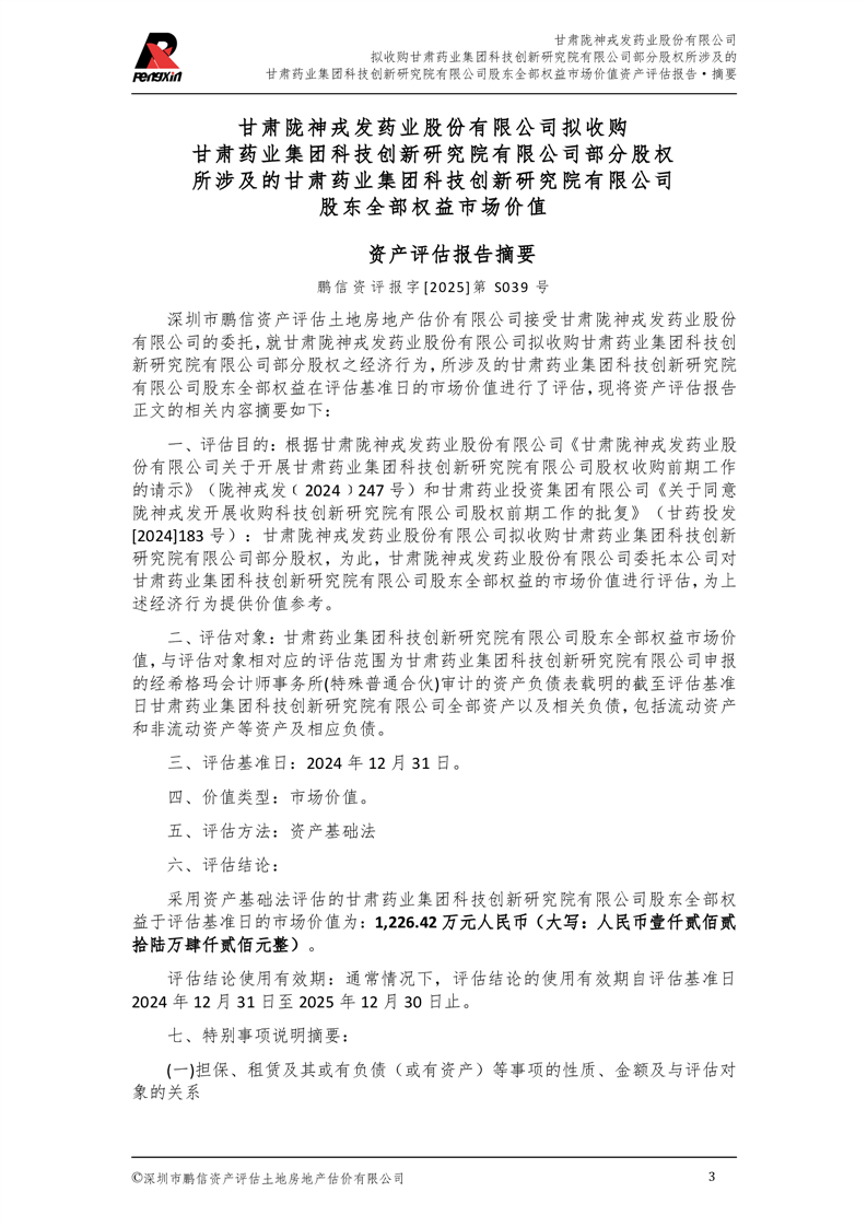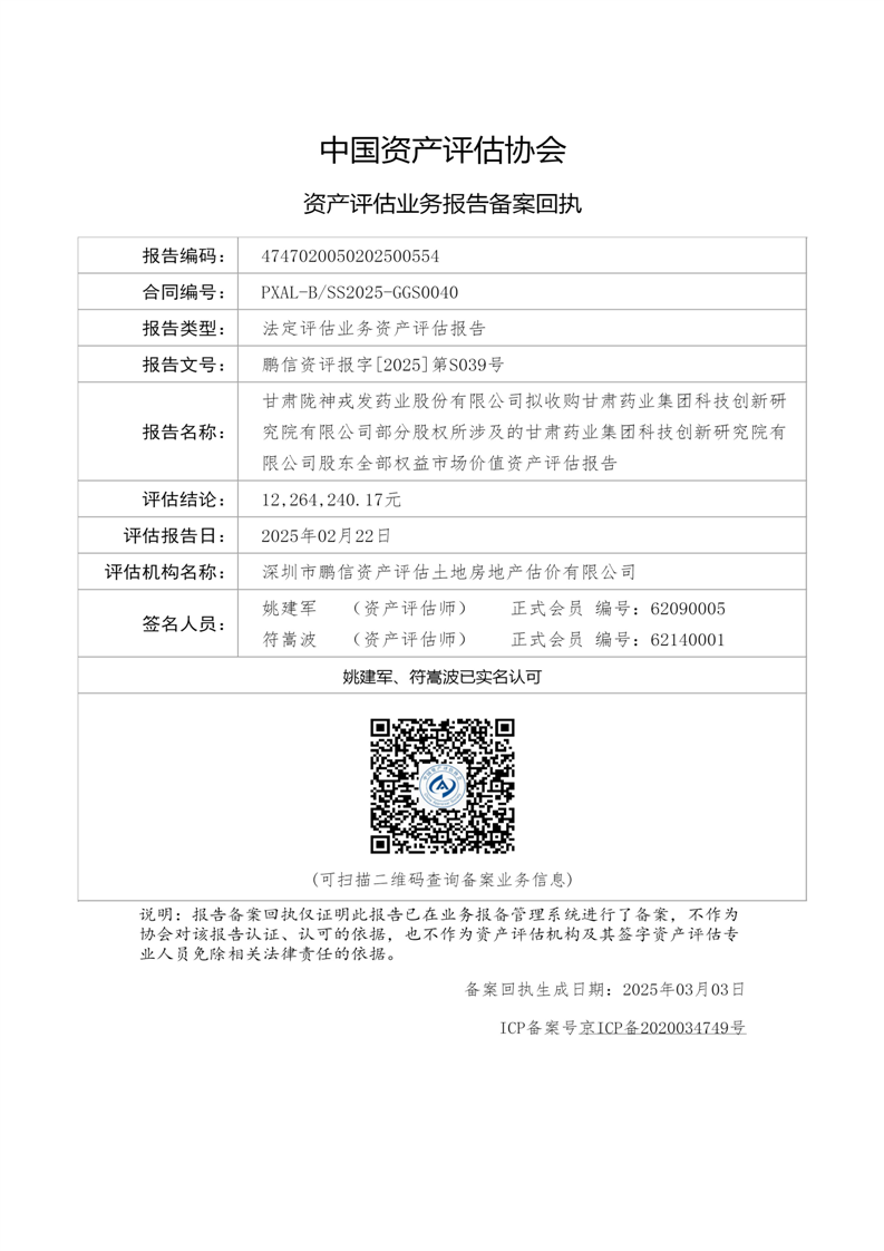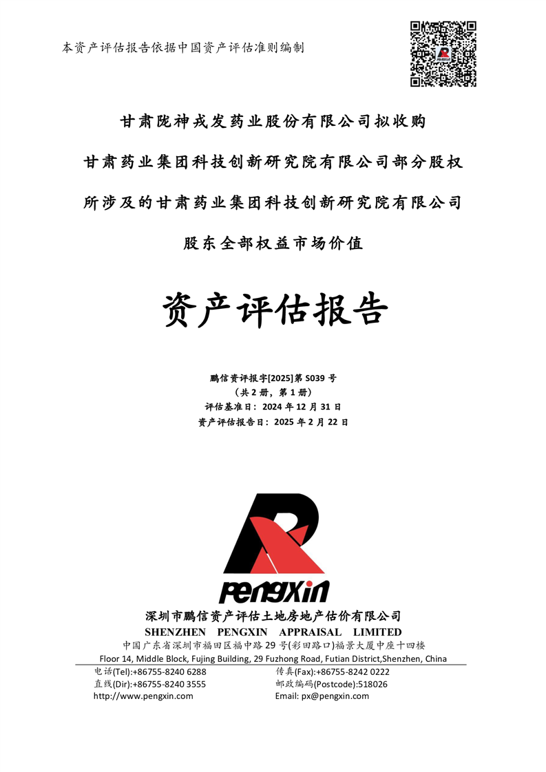 甘肅藥業集團科技創新研究院有限公司股東全部權益市場價值資產評估報告(鵬信資評報字[2025]第S039號)