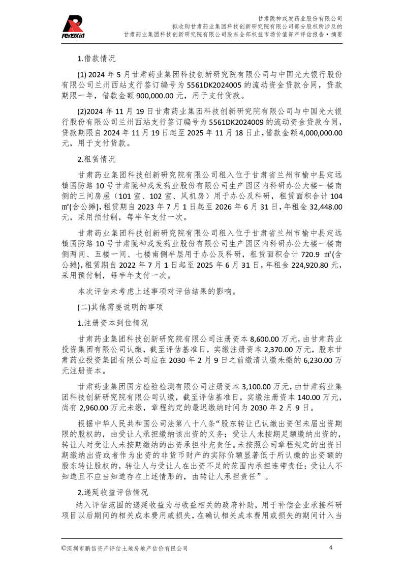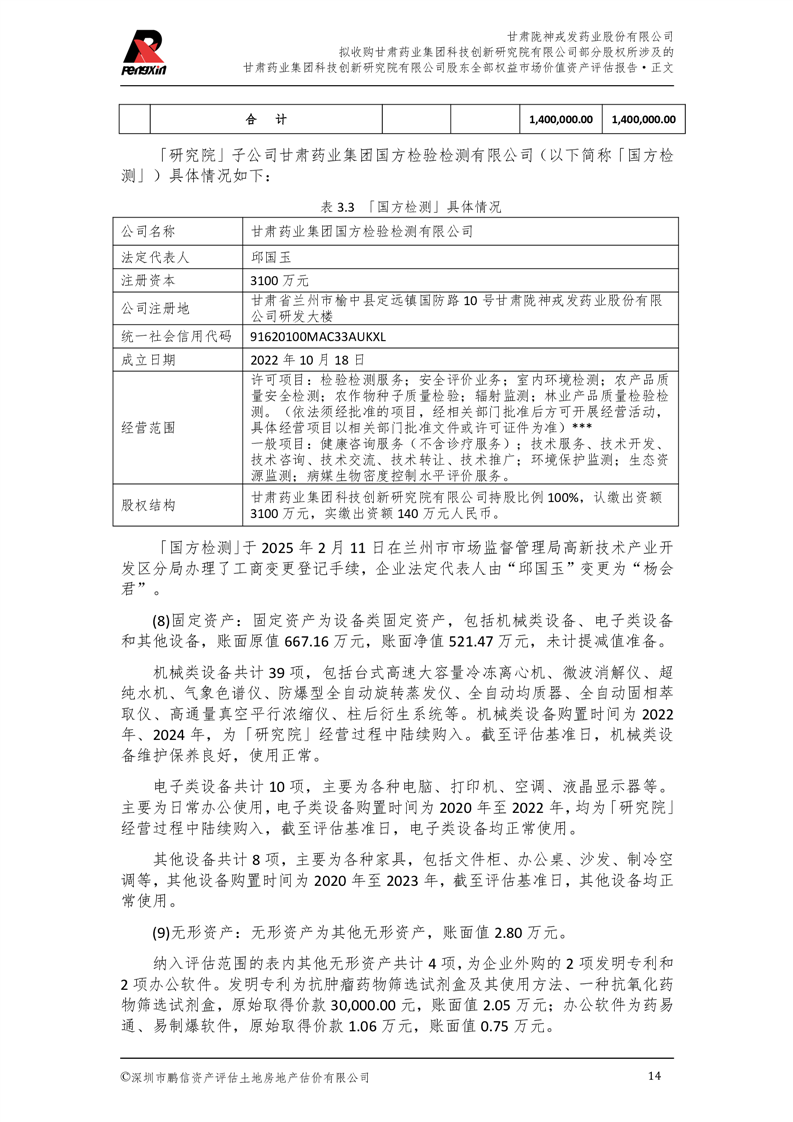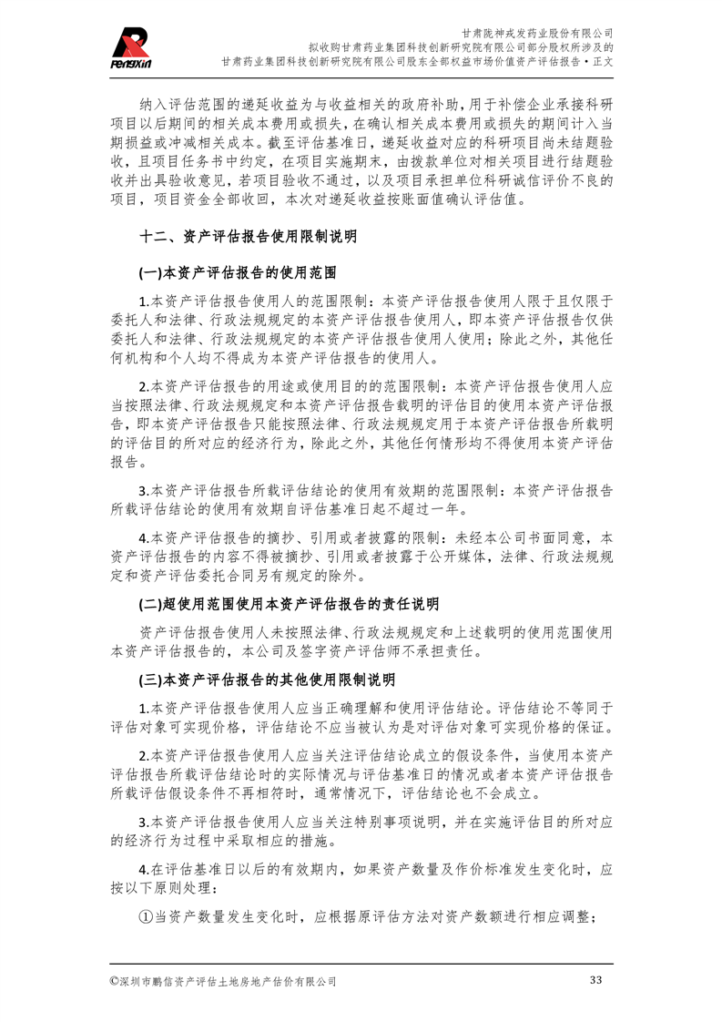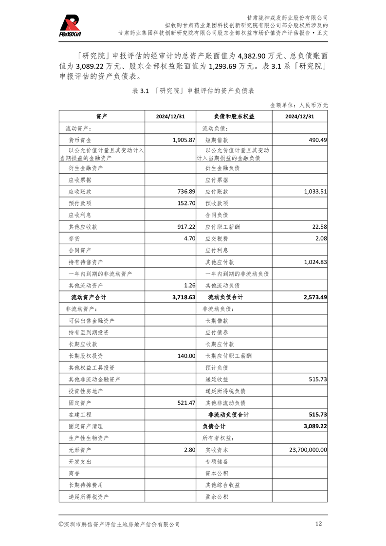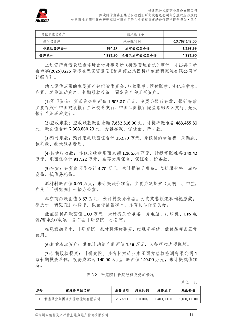 甘肅藥業集團科技創新研究院有限公司股東全部權益市場價值資產評估報告(鵬信資評報字[2025]第S039號)